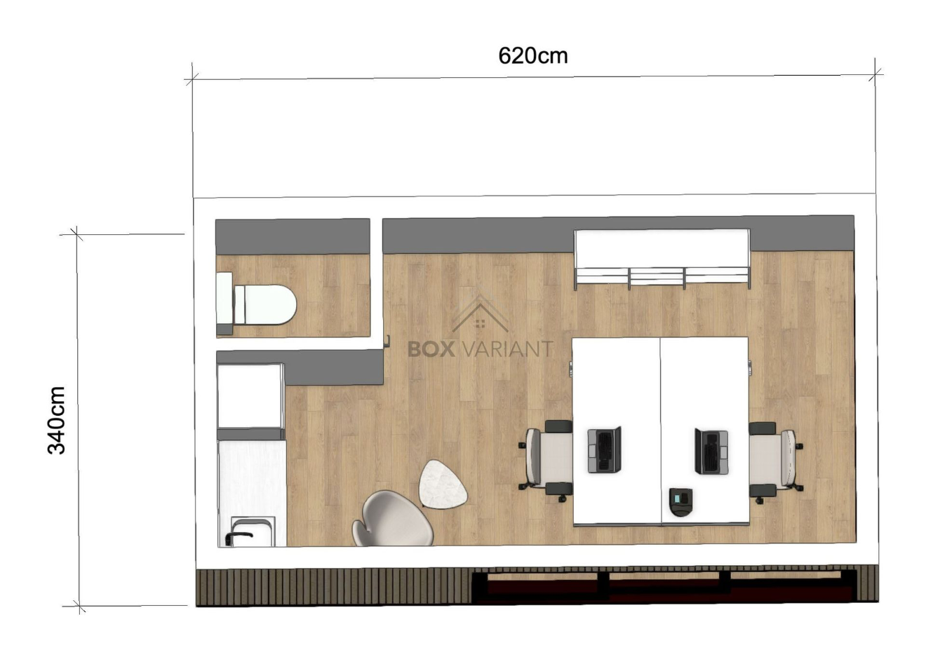 De standaardindeling bestaat uit een lichte en open werkruimte, met voldoende plek voor een bureau, een kast of een comfortabele zithoek. Dankzij de grote raampartijen valt er veel natuurlijk licht naar binnen, wat zorgt voor een prettige en productieve werkomgeving. Wil je liever een aparte opslagruimte voor materialen of apparatuur? Dan kan er eenvoudig een extra afgesloten gedeelte worden toegevoegd.