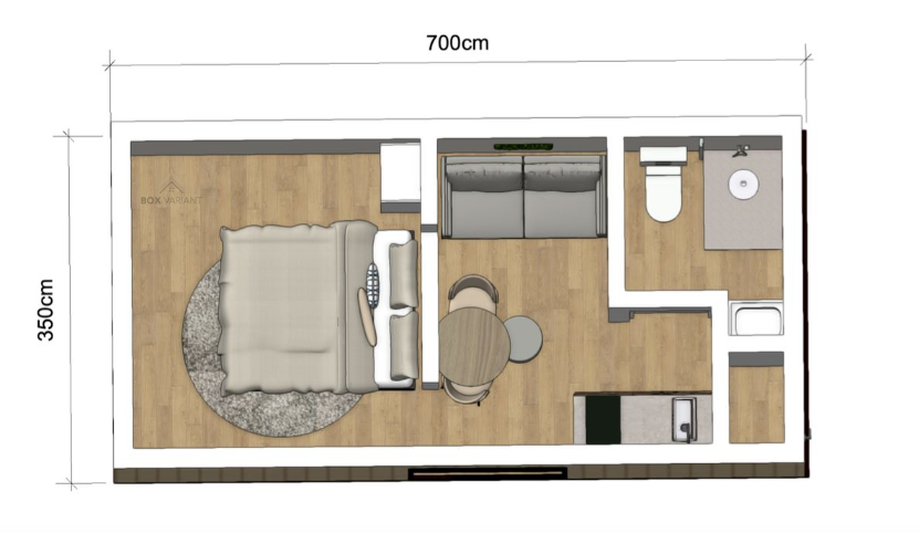 De Box Variant is ontworpen met een efficiënte en doordachte indeling, zodat gasten kunnen genieten van optimaal comfort binnen een compacte ruimte. De leefomgeving bestaat uit een lichte en open woonruimte, compleet met een comfortabele zithoek en een eethoek.