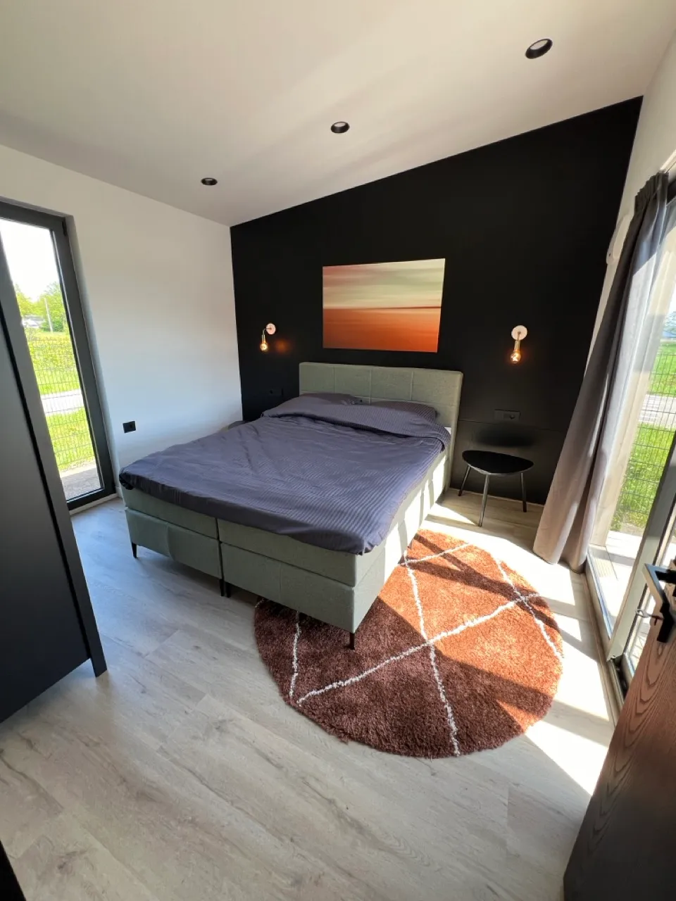 Deze moderne slaapkamer straalt rust en comfort uit. De combinatie van een donker accentmuur, warme houten vloer en natuurlijk daglicht creëert een uitnodigende sfeer. Dankzij het grote raam en de schuifpui geniet je van een prachtig uitzicht en veel lichtinval, waardoor de kamer groter en lichter aanvoelt. Een ideale plek om volledig tot rust te komen.
