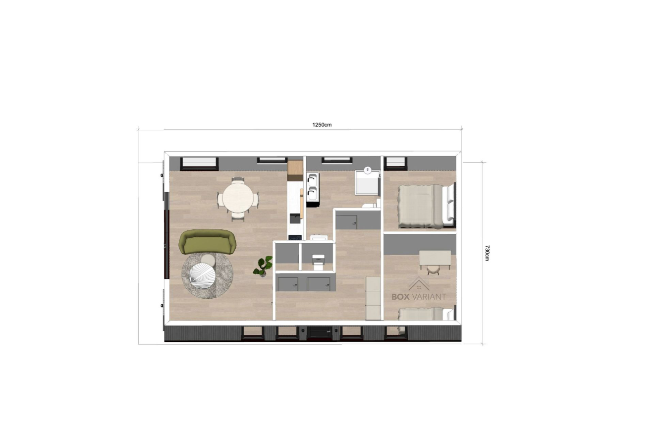 Model Terra is een eigentijdse gelijkvloerse woning met een ruim woonoppervlak van 84 m². Dankzij het dak, dat een meter uitsteekt, krijgt de woning een indrukwekkende totale afmeting van 12,50 x 7,30 meter.