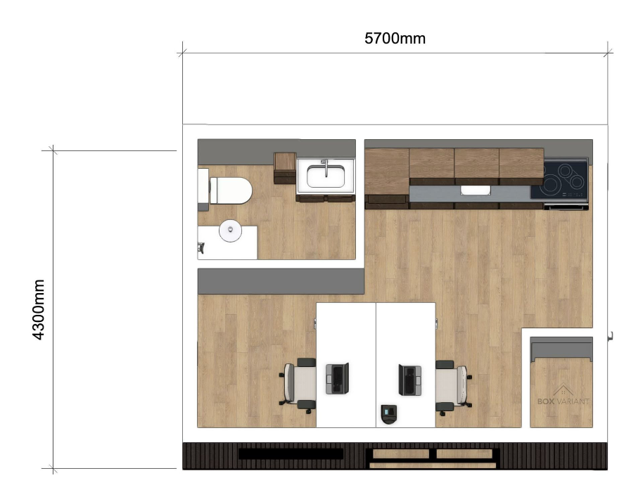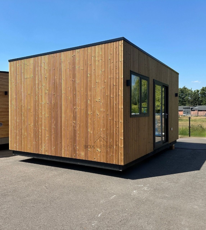 Compact van formaat, ruim in gebruik. Deze prefab unit is stijlvol afgewerkt en voorzien van alle gemakken – inclusief een complete keuken en badkamer. Perfect als rustige thuiswerkplek of als atelier.