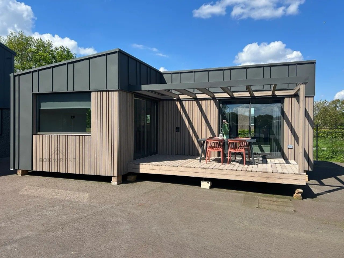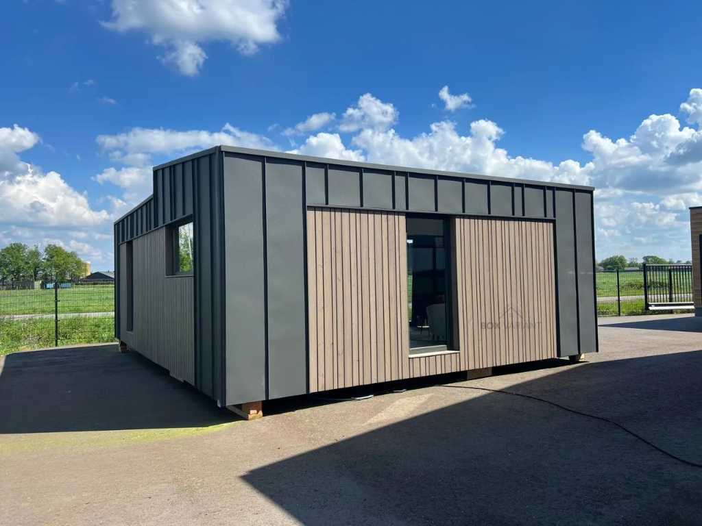 Model Crystal combineert een strakke, moderne uitstraling met duurzame materialen. De gevel bestaat uit een onderhoudsarme bekleding die bestand is tegen weer en wind, gecombineerd met stijlvolle metalen accenten die het geheel een eigentijdse en robuuste uitstraling geven.