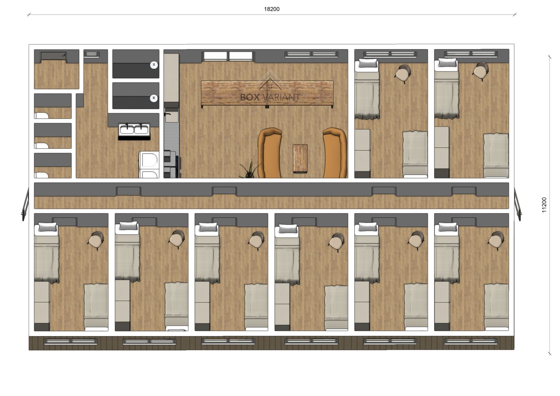 Model Aegis is met een oppervlakte van 203,8 m² een zeer royale oplossing voor grootschalige personeelshuisvesting. De woning heeft een afmeting van 18,20 x 11,20 meter en biedt comfortabel plaats aan 16 personen.