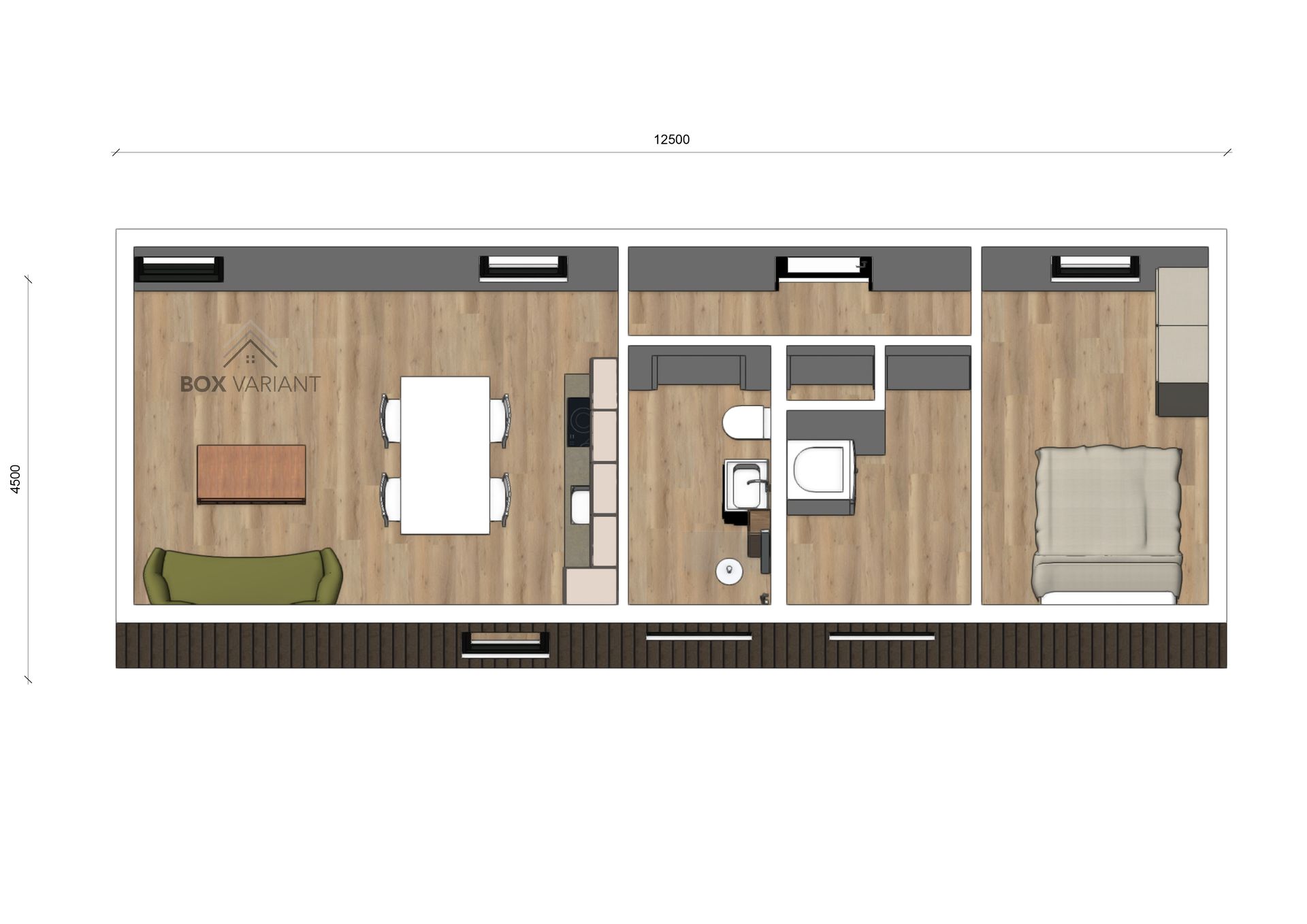De indeling is efficiënt en overzichtelijk. De ruime woonkamer met open keuken vormt het hart van de woning en biedt voldoende plek voor een gezellige zithoek en een eettafel. Grote raampartijen zorgen voor veel lichtinval en een direct contact met de buitenruimte. Naast het leefgedeelte beschikt de woning over een volwaardige slaapkamer en een badkamer die is ingericht op dagelijks gebruiksgemak. Dankzij de slimme verdeling van de meters voelt de woning nergens krap aan, wat essentieel is om comfortabel te leven.