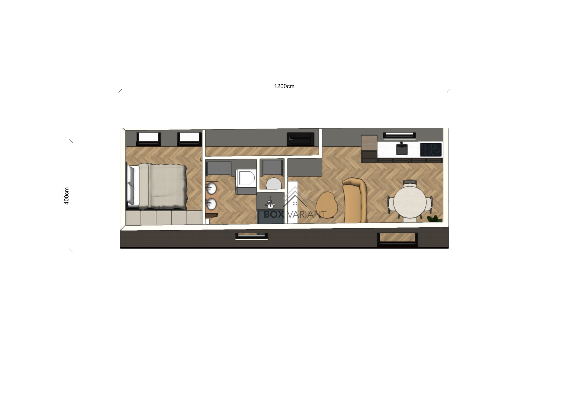 Model Ember is een stijlvolle gelijkvloerse woning met een efficiënt woonoppervlak van 48 m². Met zijn slanke afmetingen van 12,00 x 4,00 meter is deze woning speciaal ontworpen voor een compacte en moderne levensstijl, voorzien van één slaapkamer.