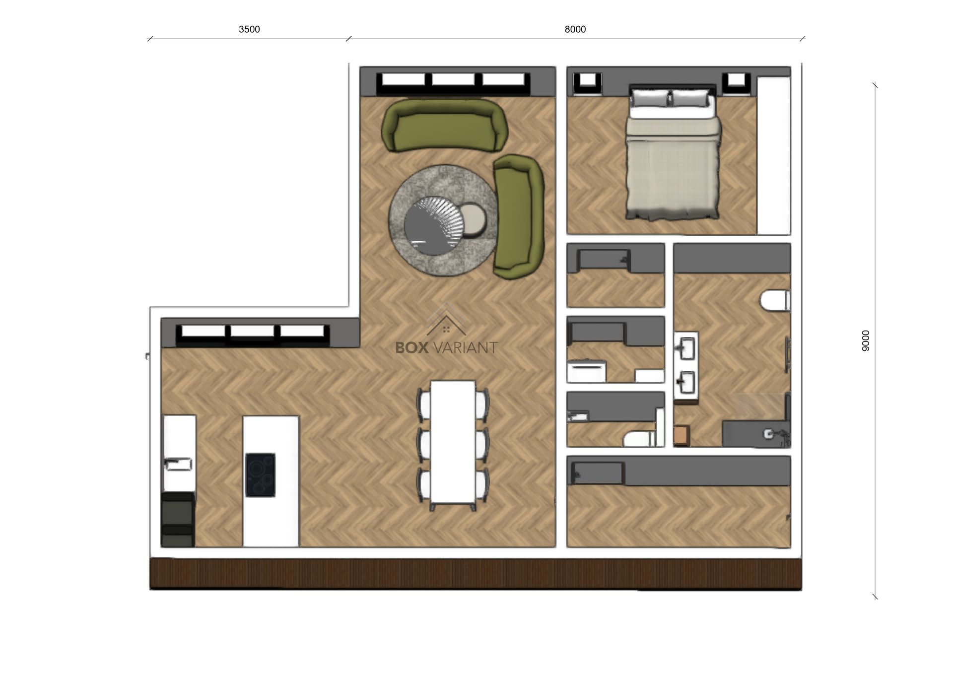 Privévertrekken: Aan de rechterzijde bevindt zich de hoofdslaapkamer, geflankeerd door een badkamer met dubbele wastafel.