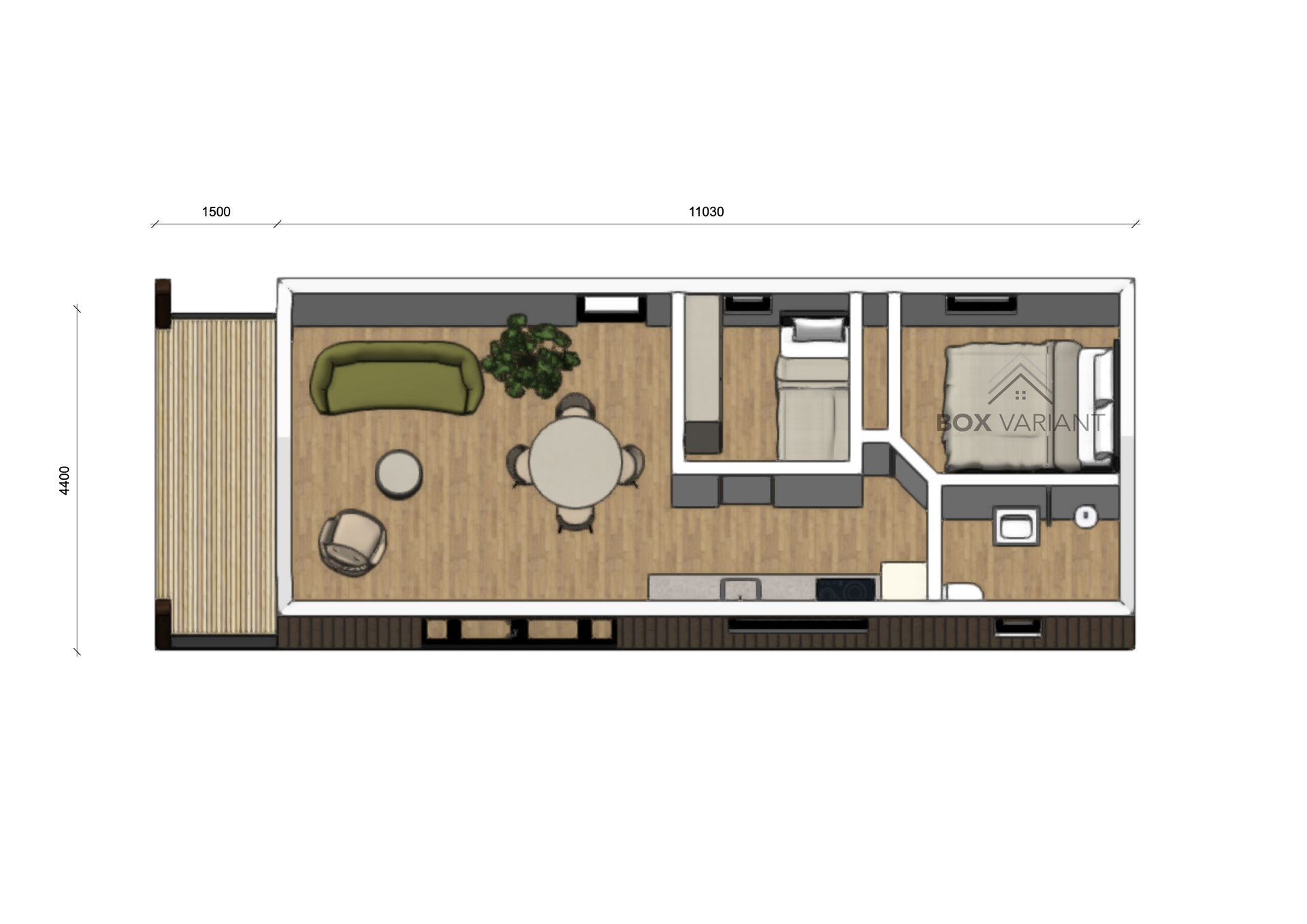 De Model Linden bewijst dat compact wonen groots kan aanvoelen. Met een oppervlakte van 48,4 m² (11 x 4,4 meter) biedt deze woning een perfecte balans tussen moderne architectuur en een warm, natuurlijk karakter.
