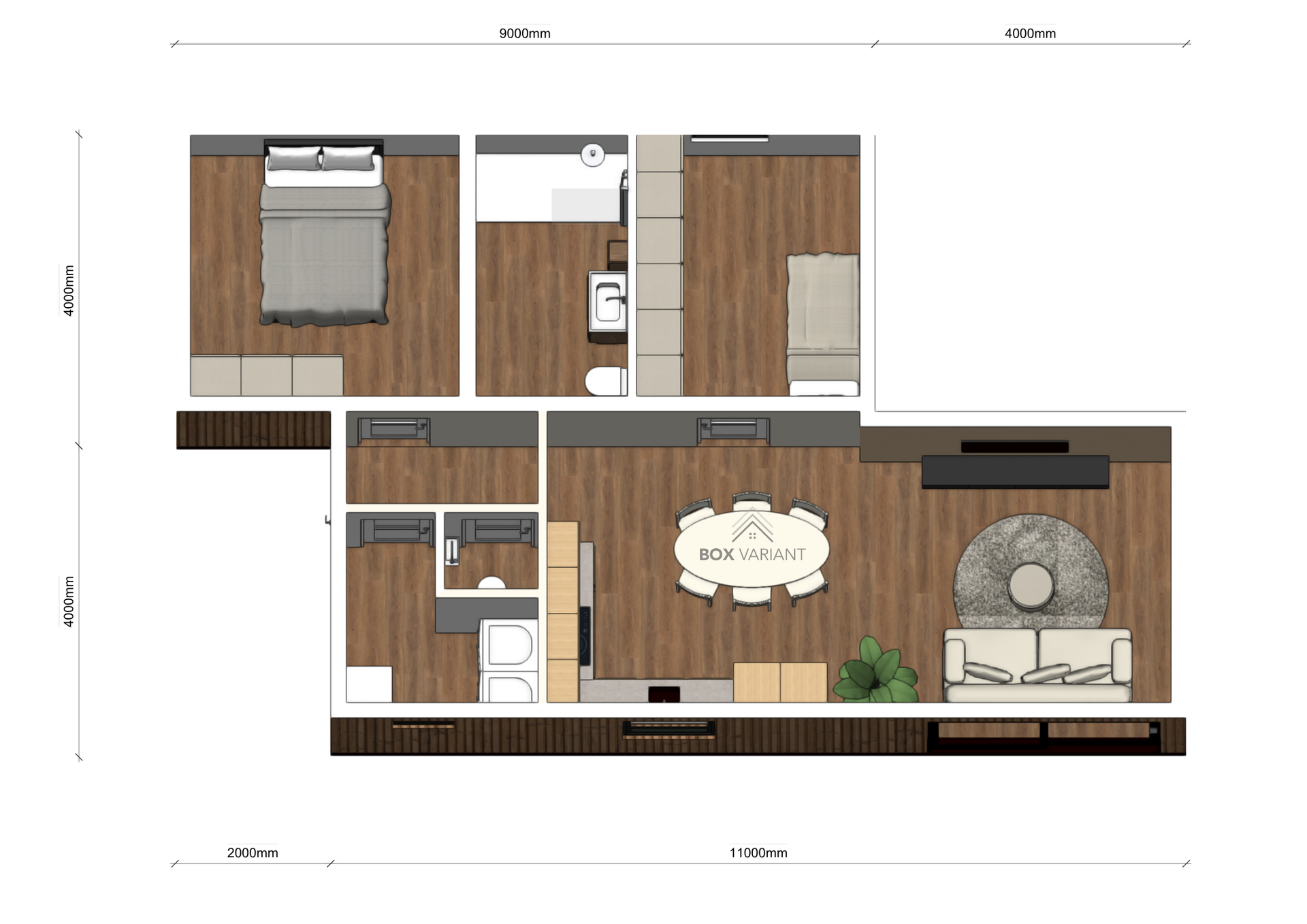 Model Oak is ontworpen met het oog op efficiëntie en comfort. De plattegrond zorgt voor een logische en ruimtelijke indeling met twee slaapkamers, een open keuken, een aparte badkamer en voldoende leefruimte.